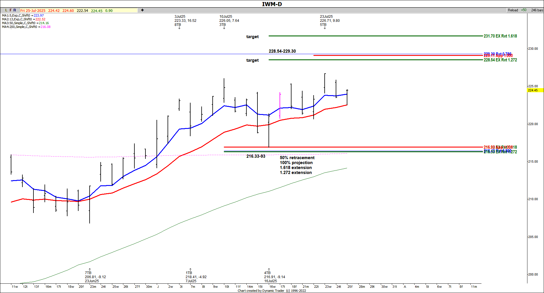 For example in our recent "royal" setup in IWM, price was clearly above the 200 and 50 simple moving averages on the daily chart and we also had the 5/13 ema combo bullish as the 5 ema was clearly above the 13 ema. The pullback zone was at the 216.33--93 area. This zone included a 50% retracement along with a 100% projection (symmetry) and two Fibonacci price extensions.