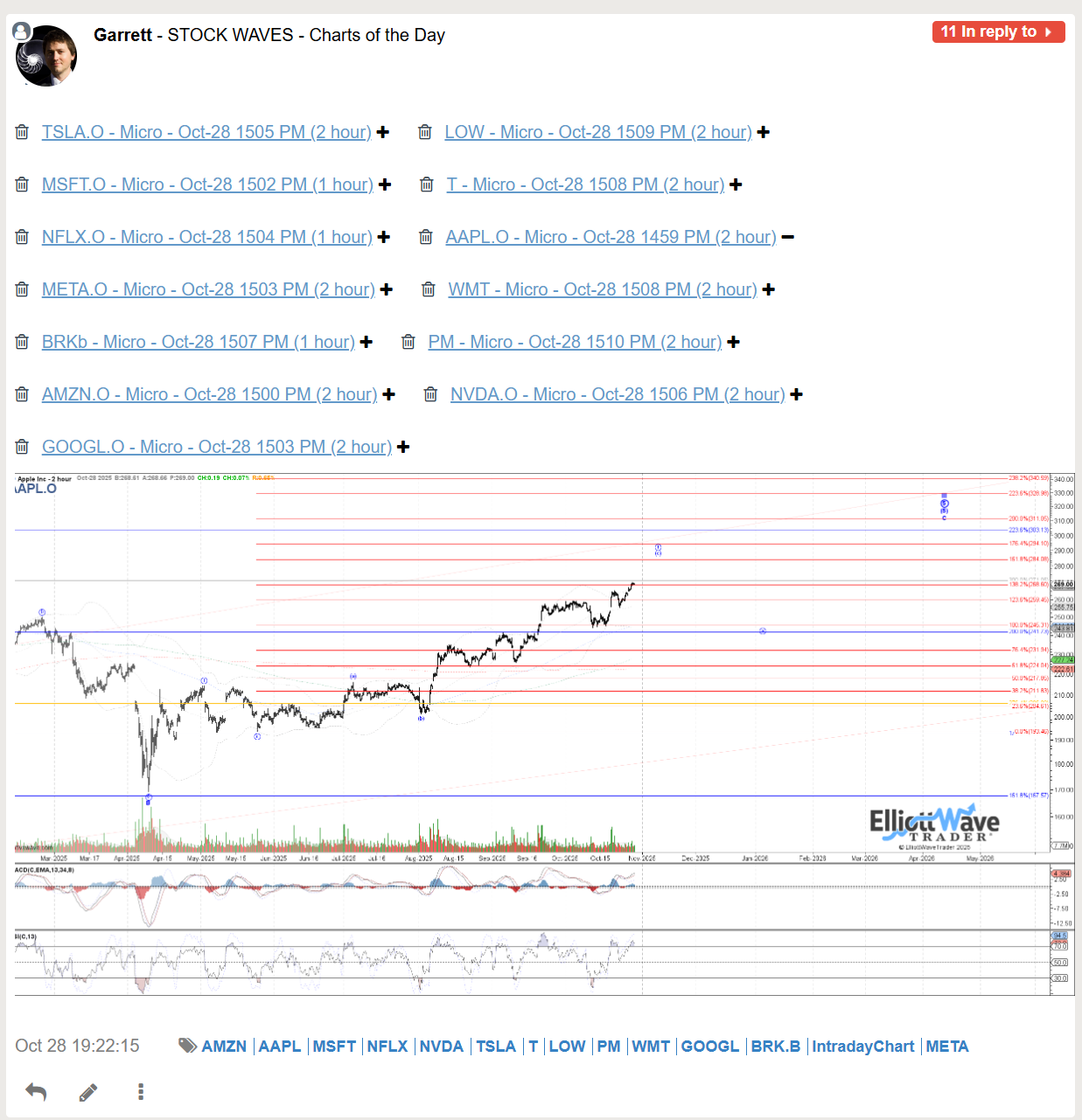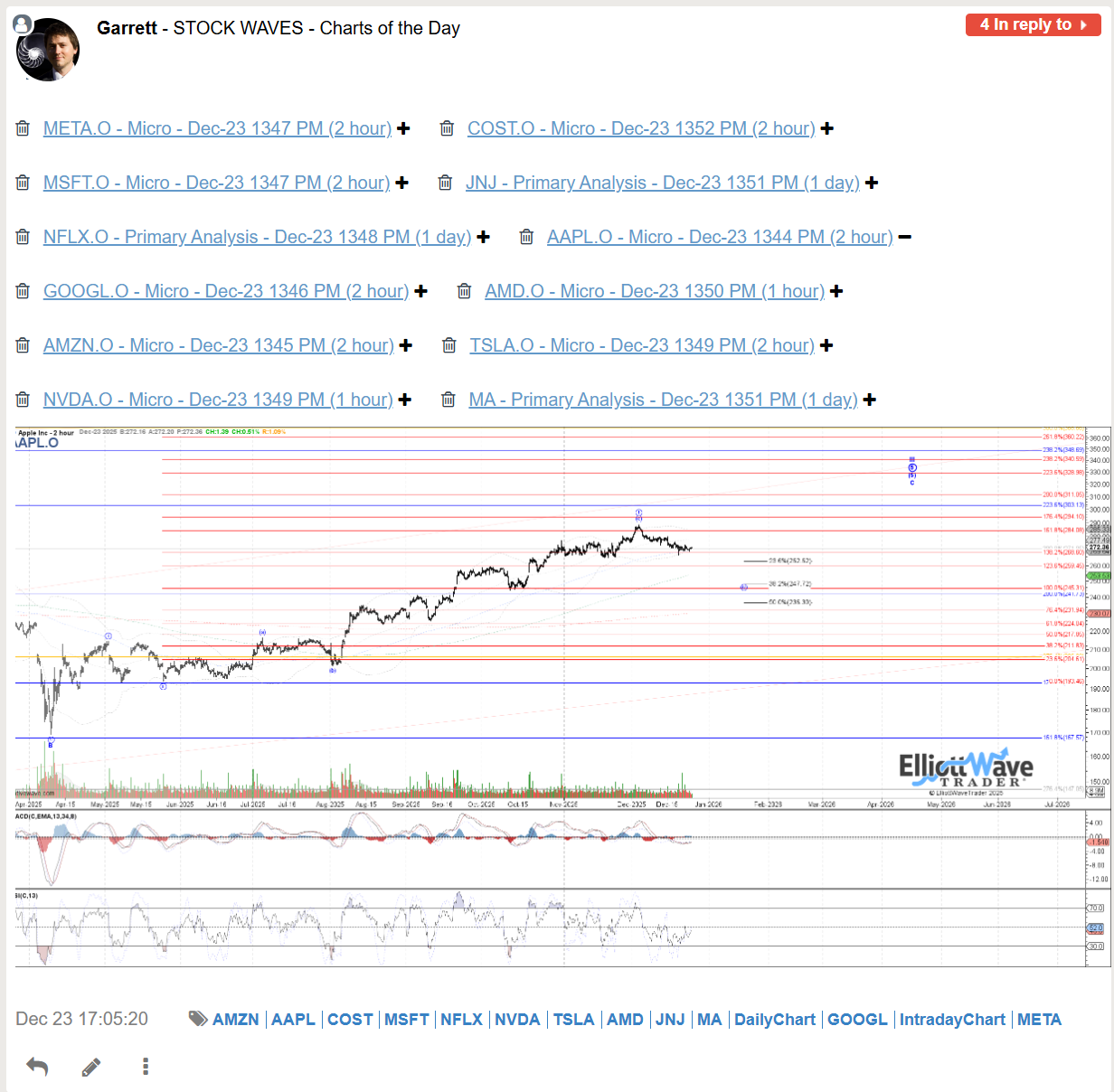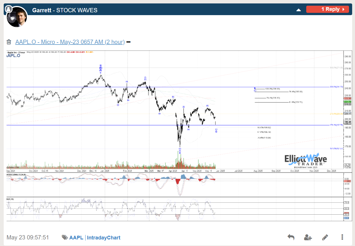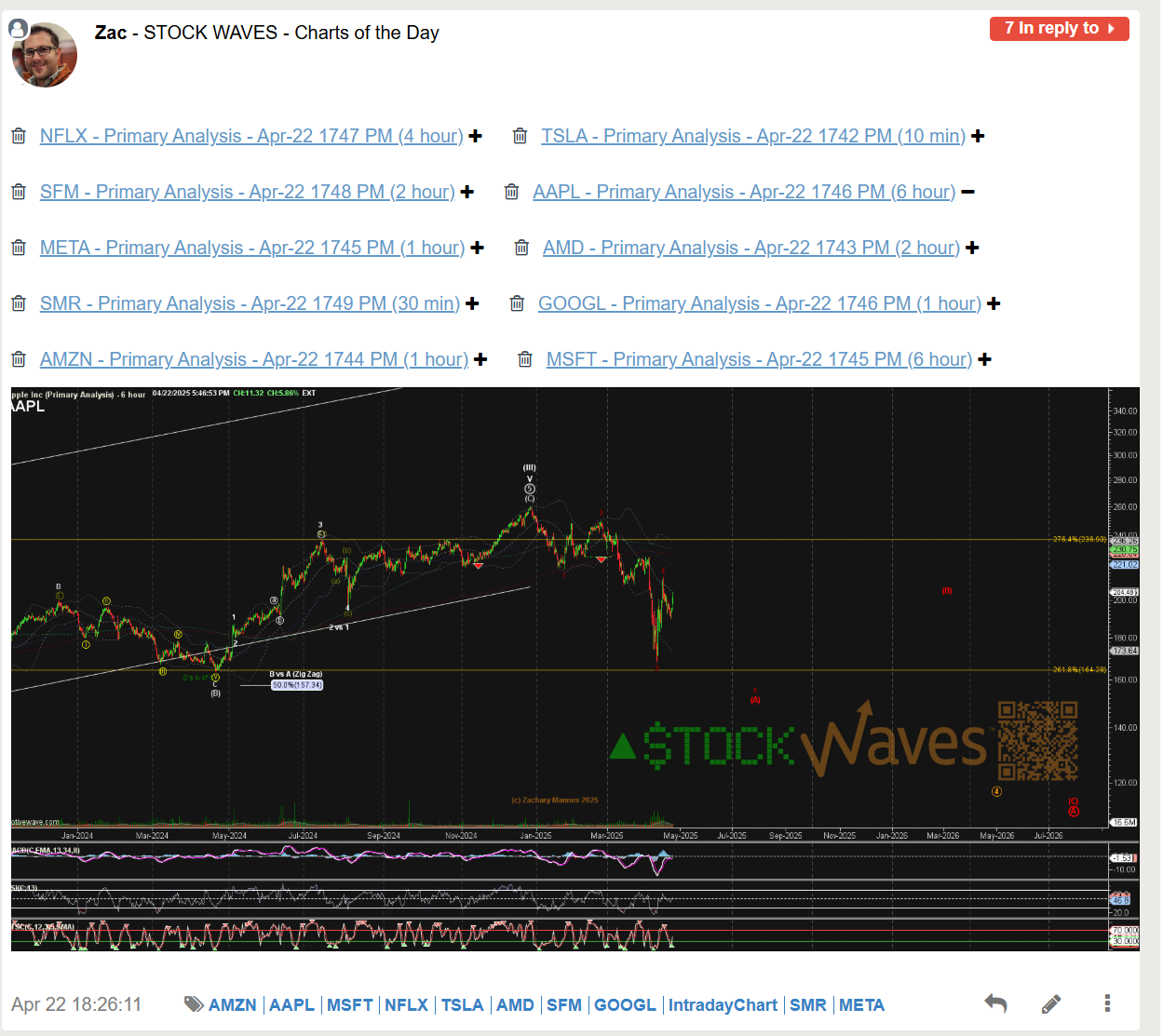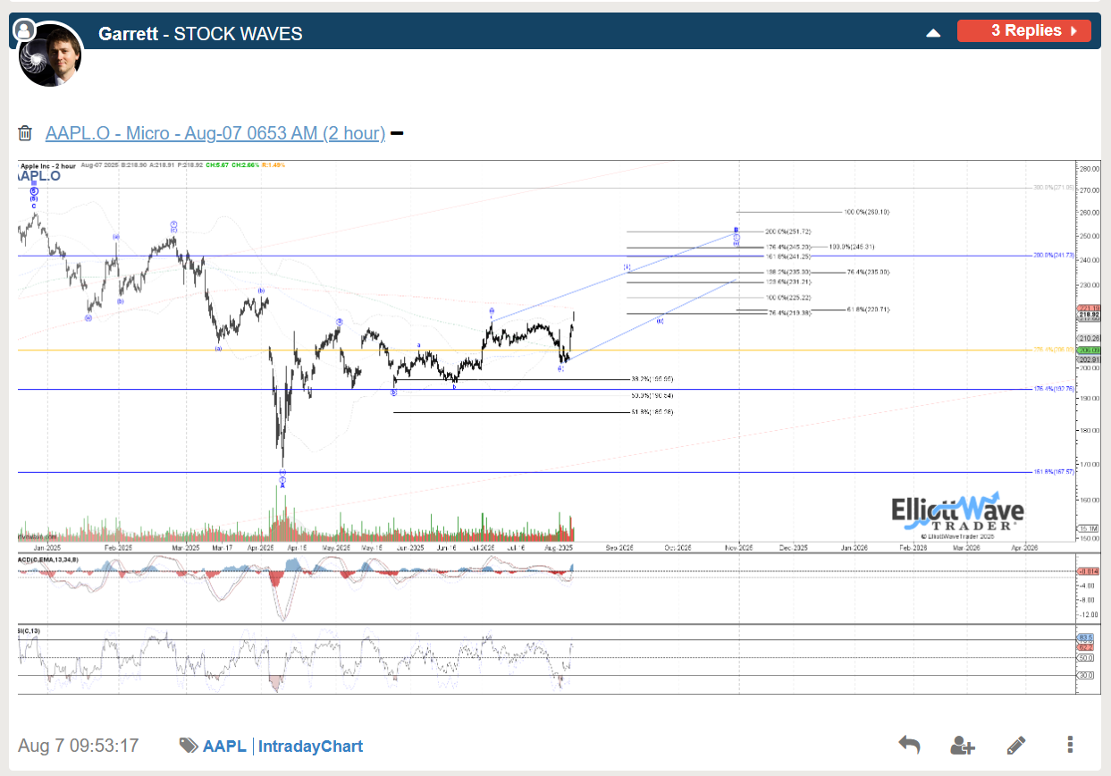The bullish journey for AAPL in 2025 was highlighted back in April in multiple Stock Waves videos with many charts receiving Wave Setups, but initially looking for a large degree B at the time, but with the potential to head to new highs for a larger wave III. Garrett only showed his primary count in this chart capture, but like many tech charts in the video was open to it being more than a bounce.