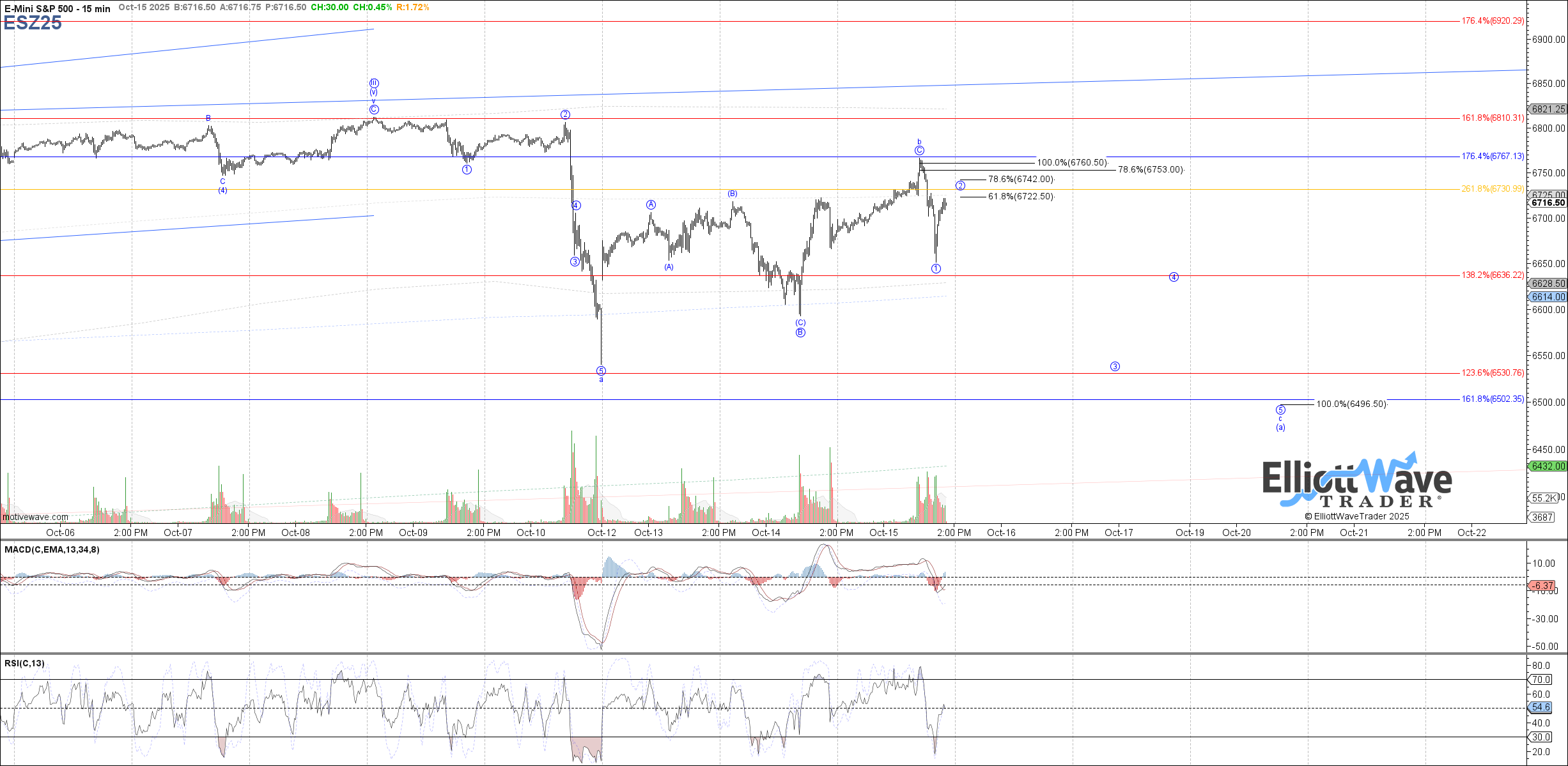 Futures drifted higher following yesterday's close, resulting in the cash chart gapping higher at the open and exceeding yesterday's high. Price continued initially higher following the open to reach the measured move fib target cited in yesterday's EOD update at 6760.50. From there price reversed sharply back down, continuing to cooperate with the expectations laid out for a b-wave bounce off of Friday's low.
