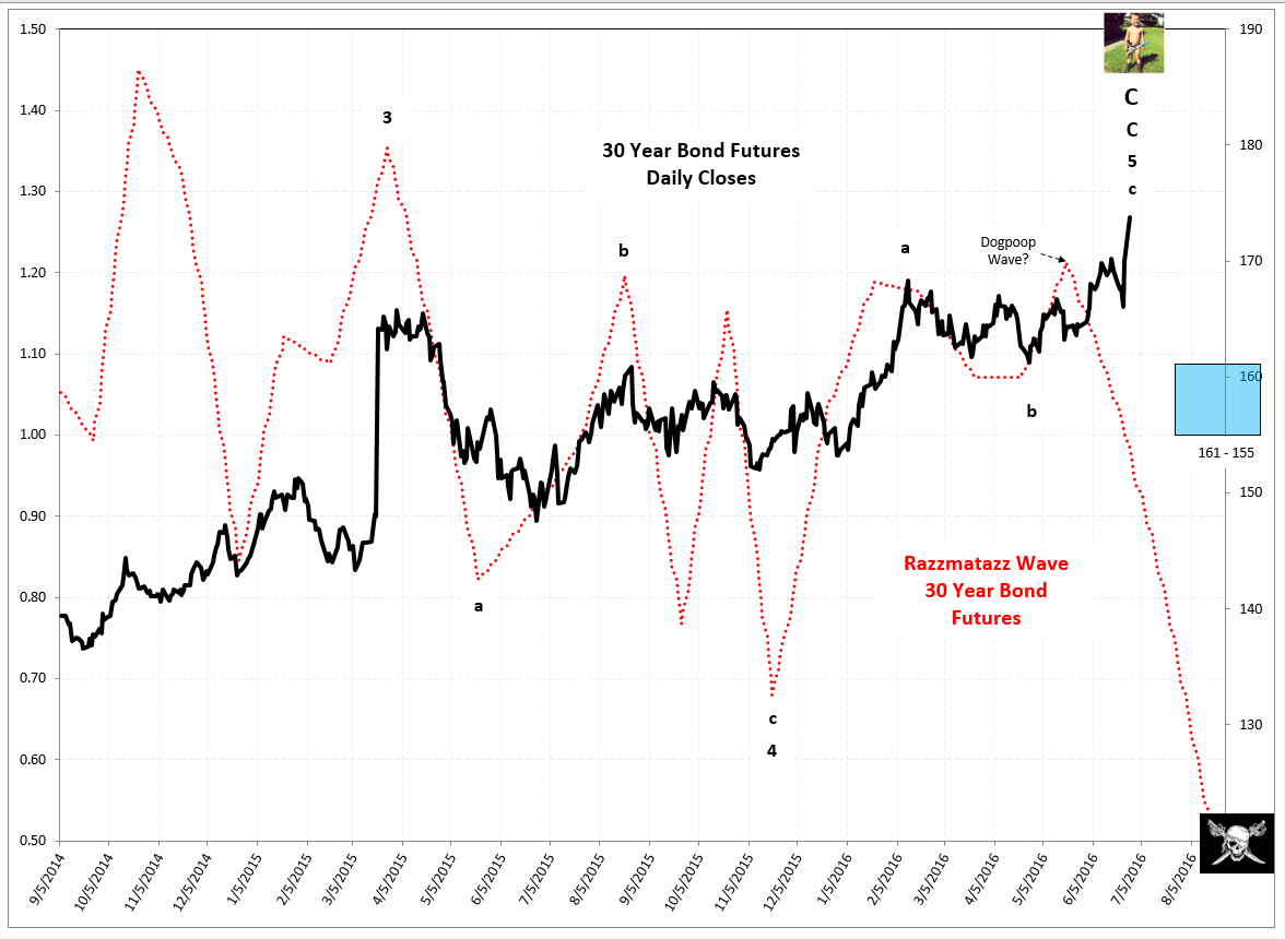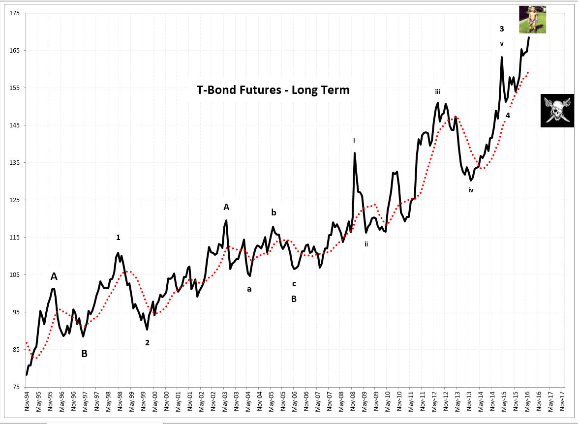 The kid standing on top of my long term T-Bond chart is my youngest grandson. His job is to make sure price does not rise above the target. He has also written some of the notes found on the charts with his stamp of approval. My general target for the first leg down in T-Bond Futures is depicted by a Skull and Crossbones. Get the picture? Anyway, I hope the lad is successful, because his inheritance will be diminished somewhat if my opinion about US Bonds turns out to be wrong. And NO trader is right all the time. Anyone who alleges that distinction is either delusional or lying.