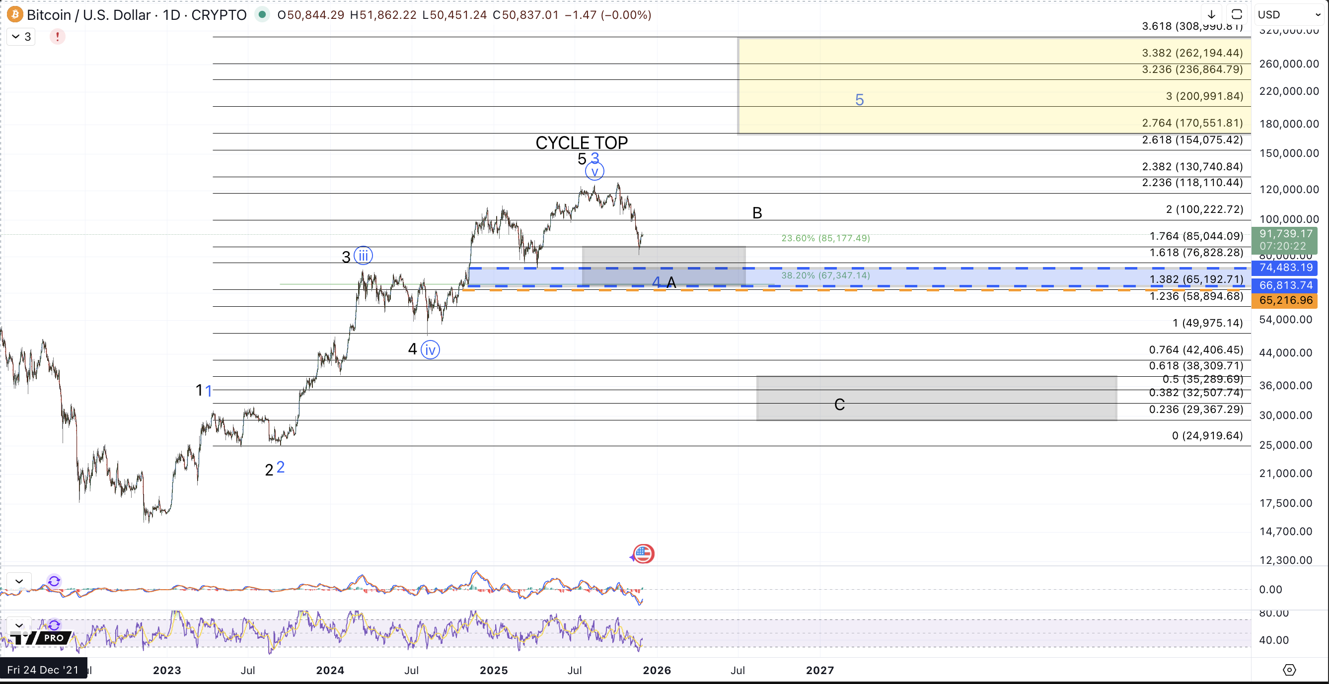 Upon writing last week's article, price had established a bottom of sorts at the November 21st low around $80.6k. The bounce up to $91.7k last weekend was sufficient for all of a wave (iv) into standard resistance which portends a wave (v) down to come.