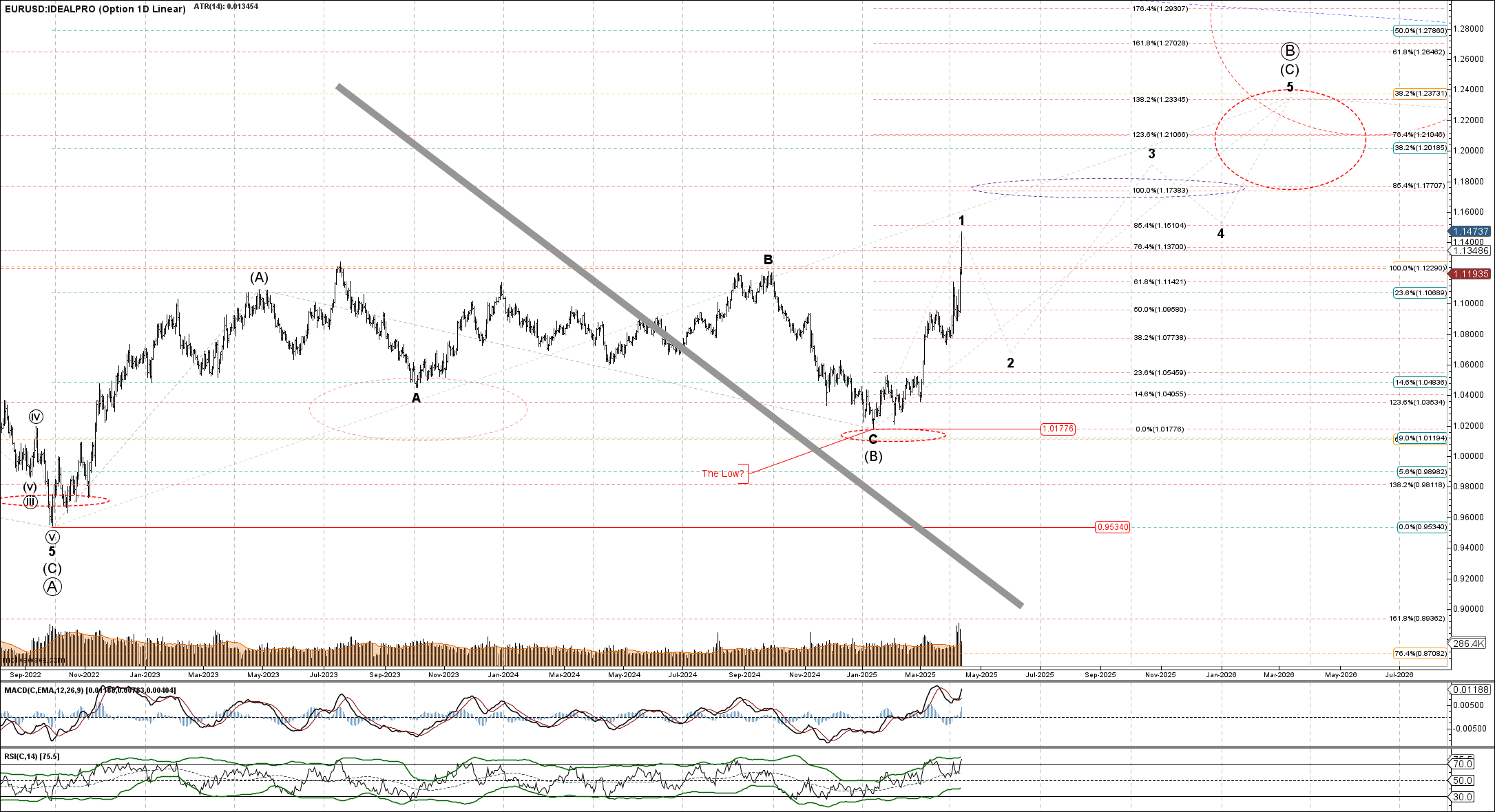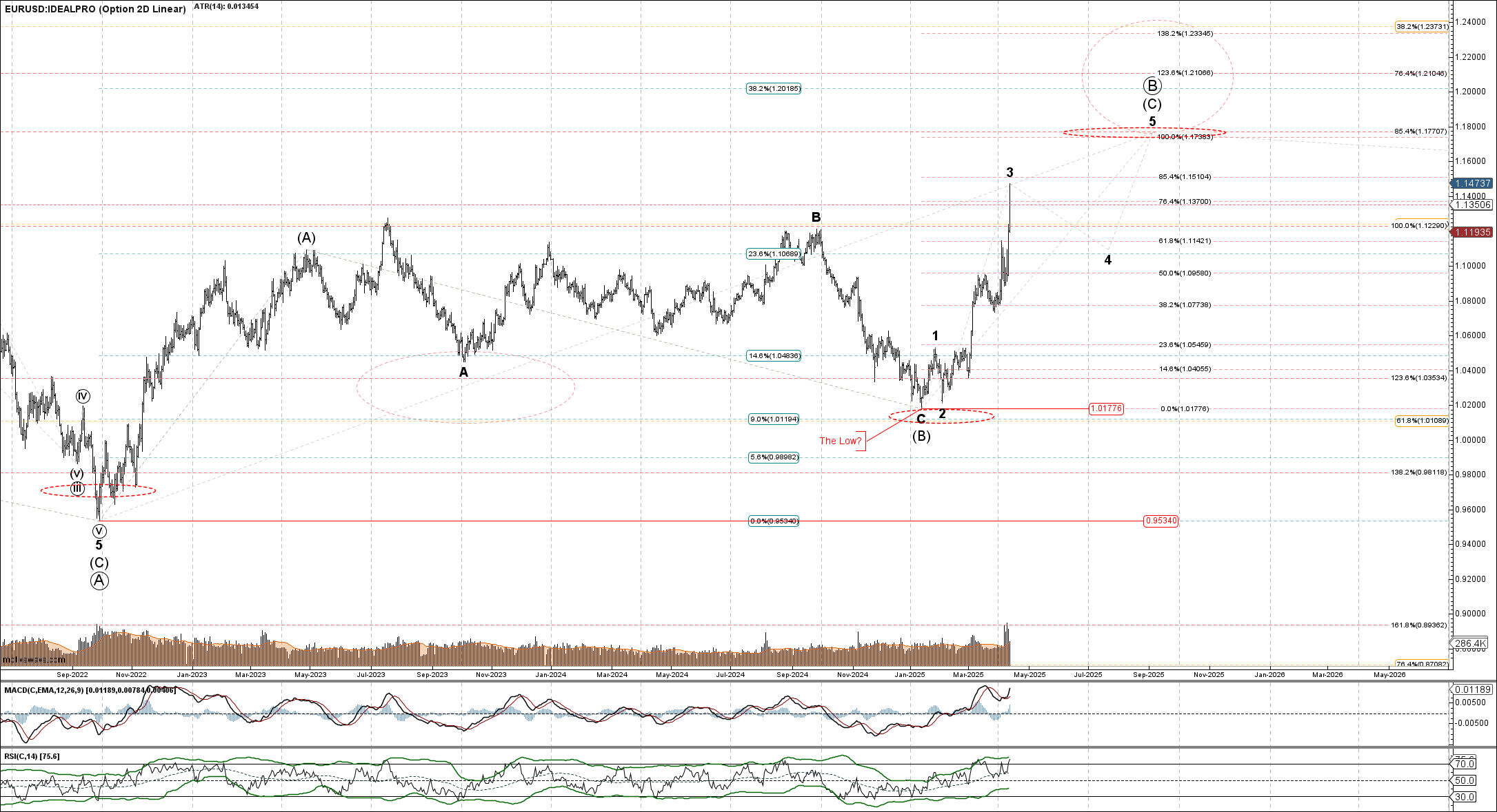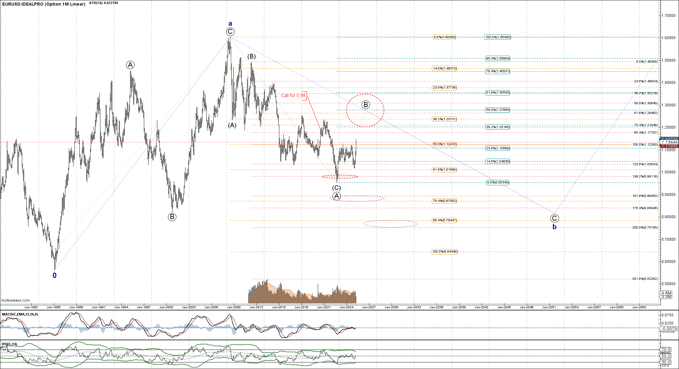 I've also re-posted the weekly chart with projected target areas for the ongoing rally. Please note the accompanying monthly chart, which presents a simplified multi-year scenario for the Euro. That said, this scenario is not high-confidence, and I currently have no clear target for the circle C-wave of the blue b-wave.