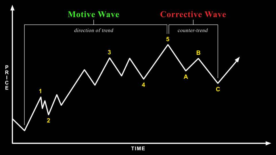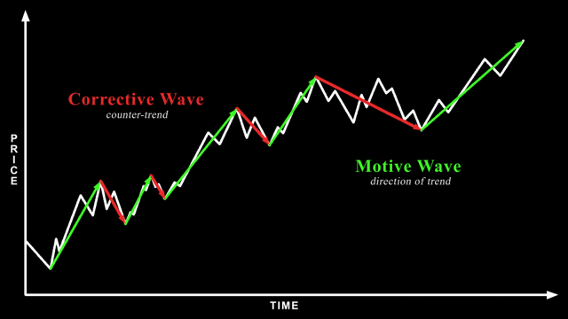 Before diving into the different categories of price patterns, let’s first establish a definition for “wave.” In the simplest terms, waves are upward and downward price swings. More specifically, waves are repetitive patterns that either progress or interrupt the direction of the larger trend. This difference in function results in two classes: motive waves and corrective waves.
