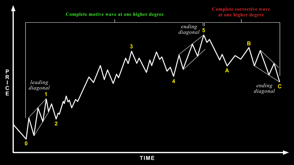 There are two varieties of diagonal patterns: leading diagonals and ending diagonals. As their names imply, leading diagonals only occur at the origin point of a larger pattern and ending diagonals only occur at the termination point of a larger pattern. Wave 3, the middle of a motive pattern, is never a diagonal.