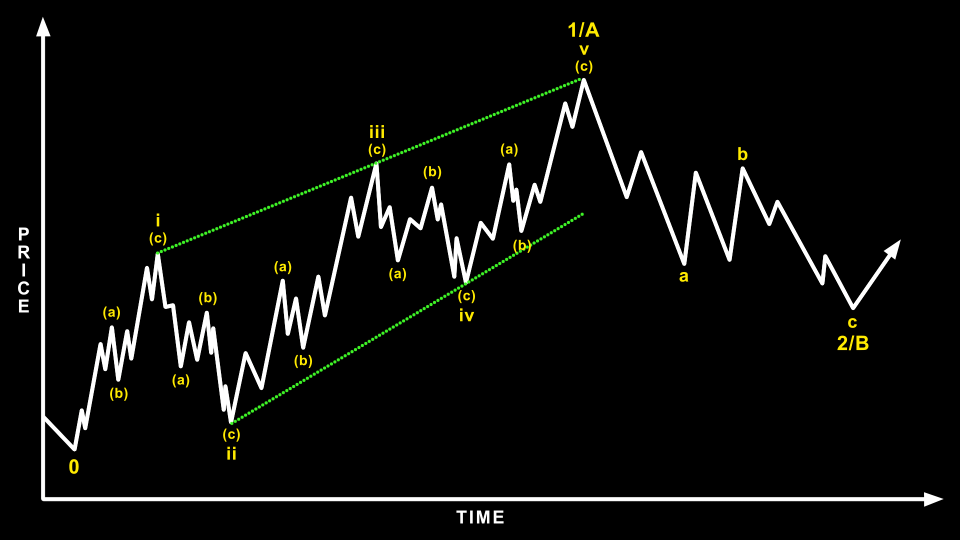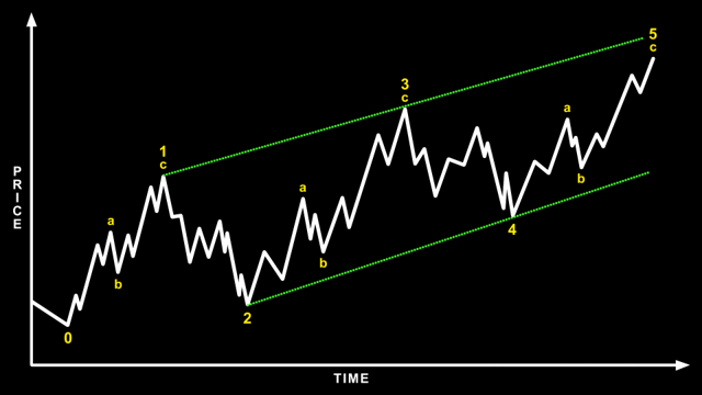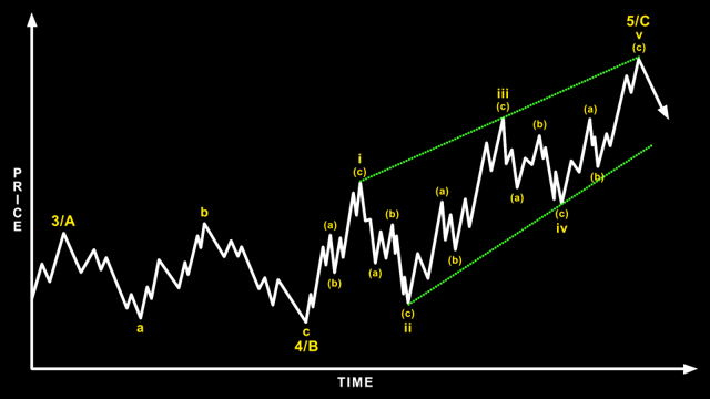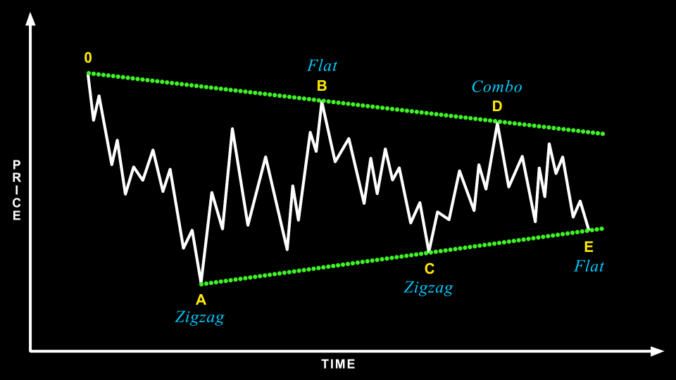 The result is a more labored advance and often overlap between waves 1 and 4 (although not a requirement). This tends to form a parallel, contracting, or in rare instances expanding trend channel as the diagonal unfolds. The subwaves will typically form as zigzags or flats, but occasionally a combination or triangle (if wave 4) can occur.
