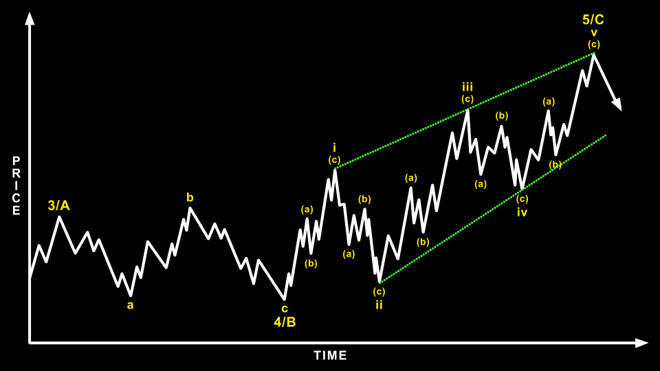 Ending diagonals appear in the wave 5 position of a motive pattern and the C-wave position of a corrective pattern. Unlike leading diagonals, ending diagonals cannot subdivide as a 5-3-5-3-5 structure, only a 3-3-3-3-3 structure.