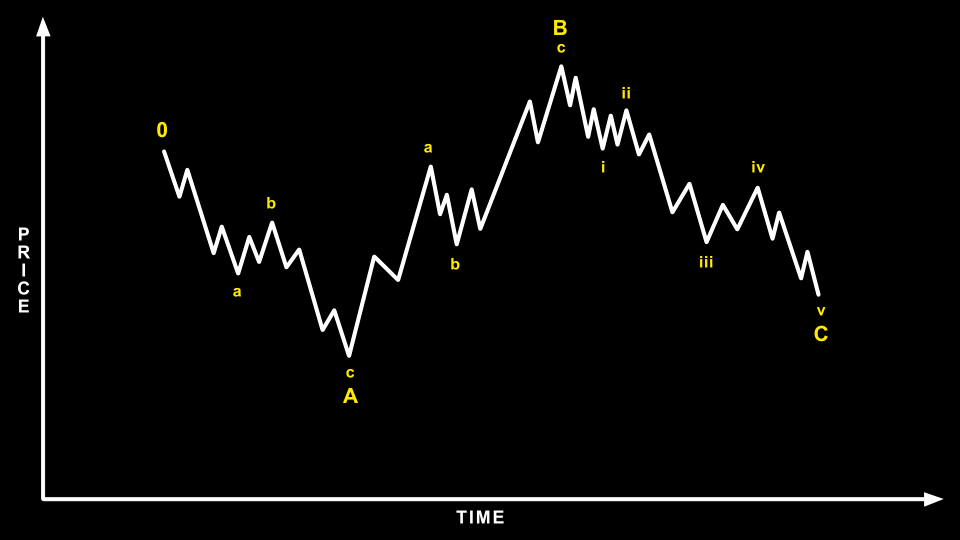 An expanded flat occurs when wave B retraces beyond the origin of wave A. This results in further progress made in the direction of the trend at one higher degree, implying a strong underlying trend since it’s being achieved by a corrective wave. Therefore, expanded flats generally precede or follow extended actionary waves, usually wave 3 of an impulse.
