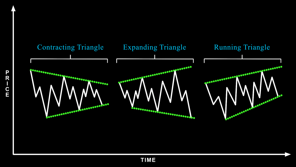 Running Triangles are the rarest variety, occurring when the underlying trend is so strong that the overall structure is skewed in the same direction, similar to a running flat. The trend lines connecting the price extremes of each subwave will either be contracting or parallel, but both sloping in the direction of the underlying trend.