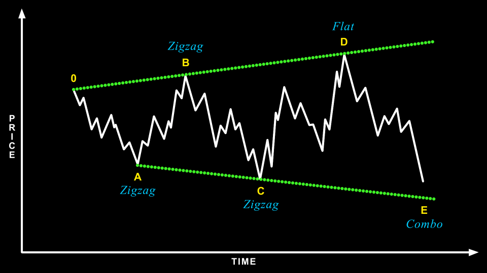 Combinations come in two varieties: a double combination and a triple combination. The latter is less common, but as their name suggests they are composed by a combination of zigzags, flats, and triangles. They also carry a different labeling than other corrective structures, using WXY for double combinations and WXYXZ for triple combinations.