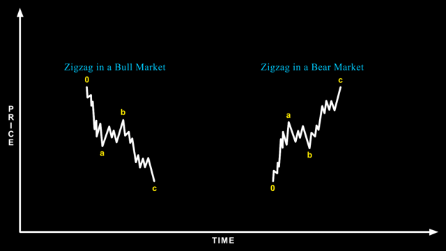 The widely adopted definition of a zigzag is a 5-3-5 substructure. However, my colleagues and I have encountered countless examples of corrections that otherwise display the same qualities as a traditional zigzag, but subdivide best as a 3-3-5 substructure. Therefore, we believe the qualification of a zigzag should be based on character rather than a strict subwave structure.