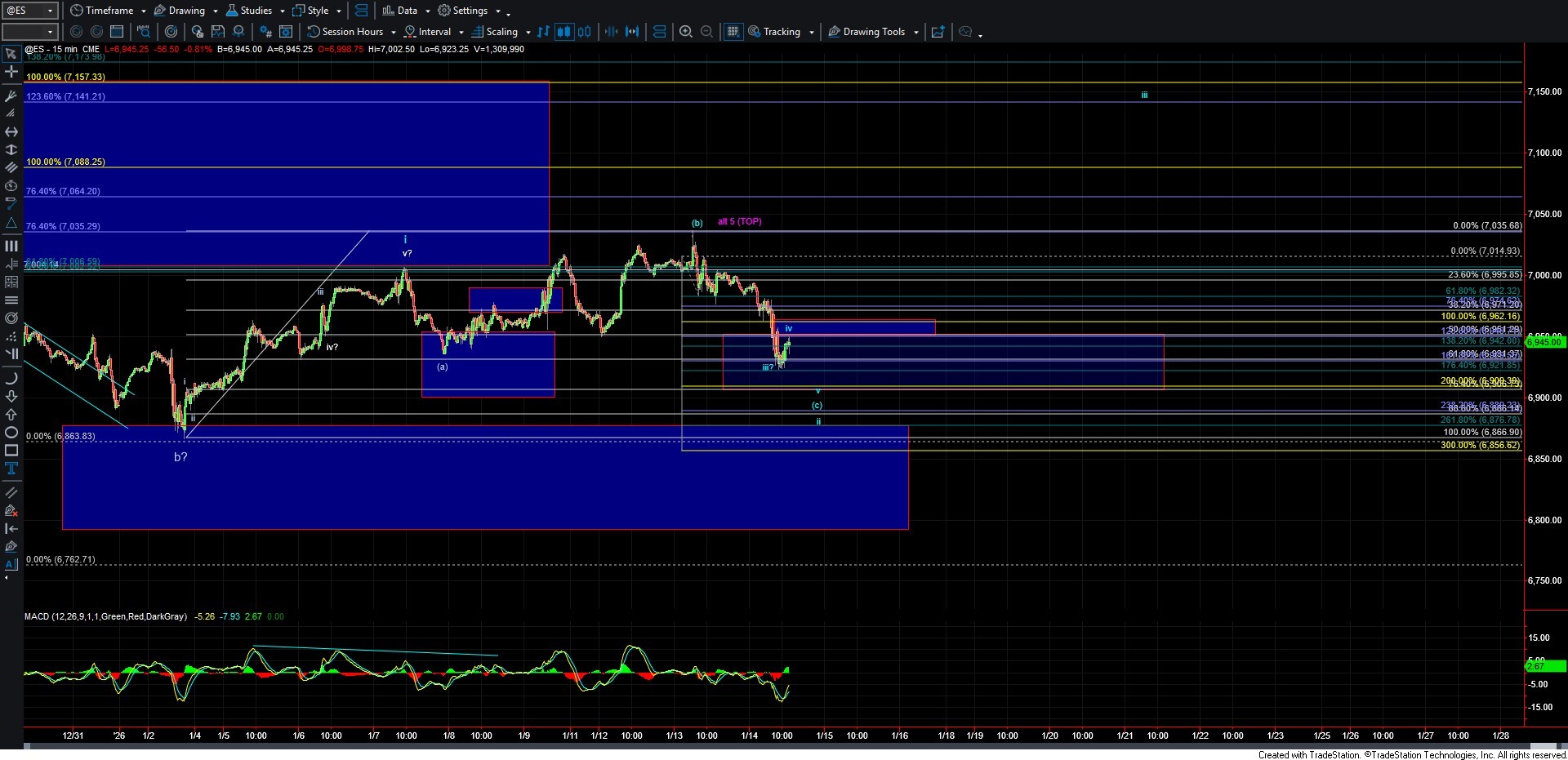Should the market break below the support zone noted above, followed by a sustained move under 6792, it would open the door to the conclusion that a larger-degree top is finally in place. For now, however, and as long as support continues to hold, my primary count remains the blue scenario, with expectations for a resolution to the upside.