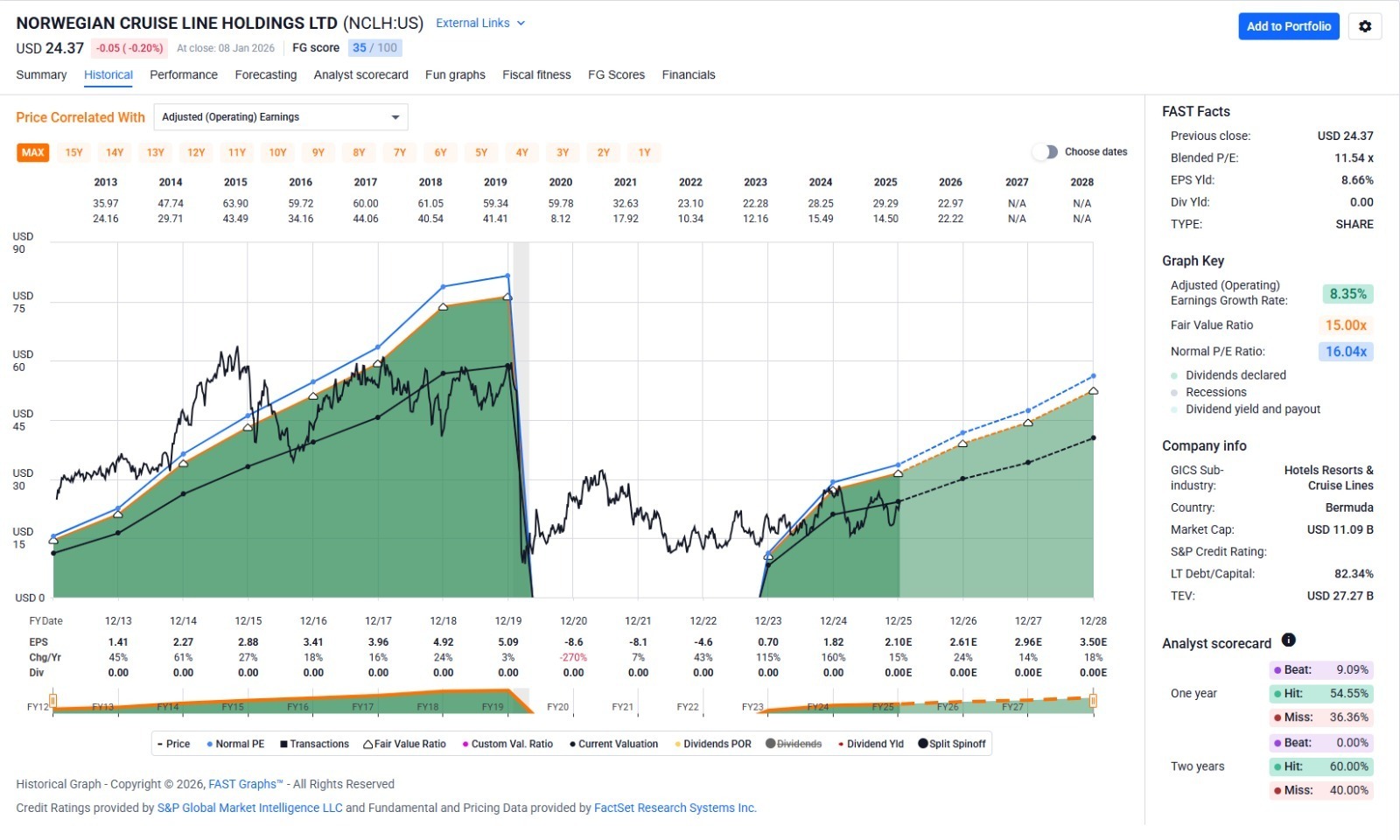 Clearly the pandemic years were tough on NCLH with earnings initially falling off a cliff and then slowly recovering. As of December we can see that based on adjusted earnings, NCLH was trading pretty much right at fair value, but also that NCLH is projecting a slow and steady growth curve over the next few years.