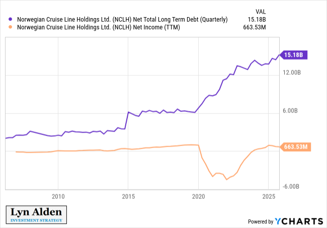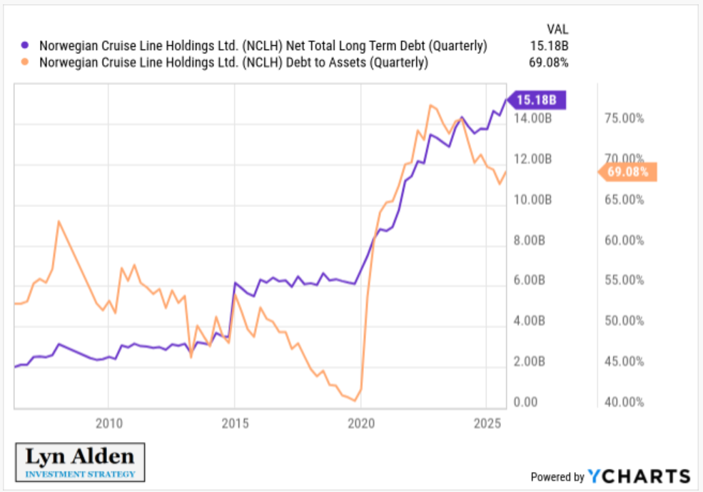 “I’m moderately bullish on NCLH and expect the price to trend upward in the years ahead. One of the biggest risks for investors to be aware of, however, is the increase in leverage ever since the pandemic. In addition to diluting shares, the company has issued quite a bit of debt, both in absolute terms and relative to their asset base and net income. Thus, I treat it as a rather risky stock and one to watch pretty closely, rather than treating it as a buy-and-forget type of investment.”