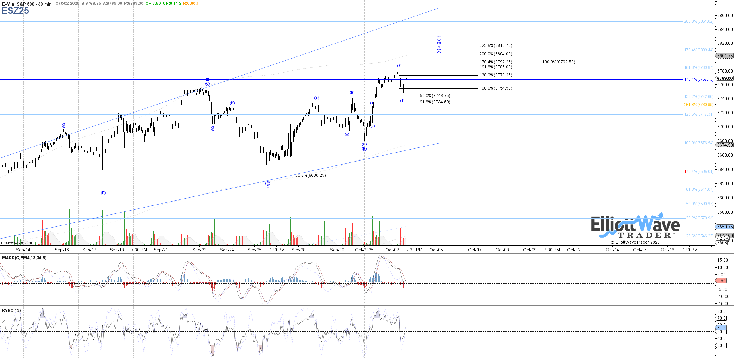 The market turned immediately down after the open this morning, following expectations for a corrective pullback as wave (4) of C discussed in the premarket update. The pullback this morning ended up reaching the lower end of the fib support cited for wave (4) at 6744, which has so far held and been followed by a nice rally this afternoon.