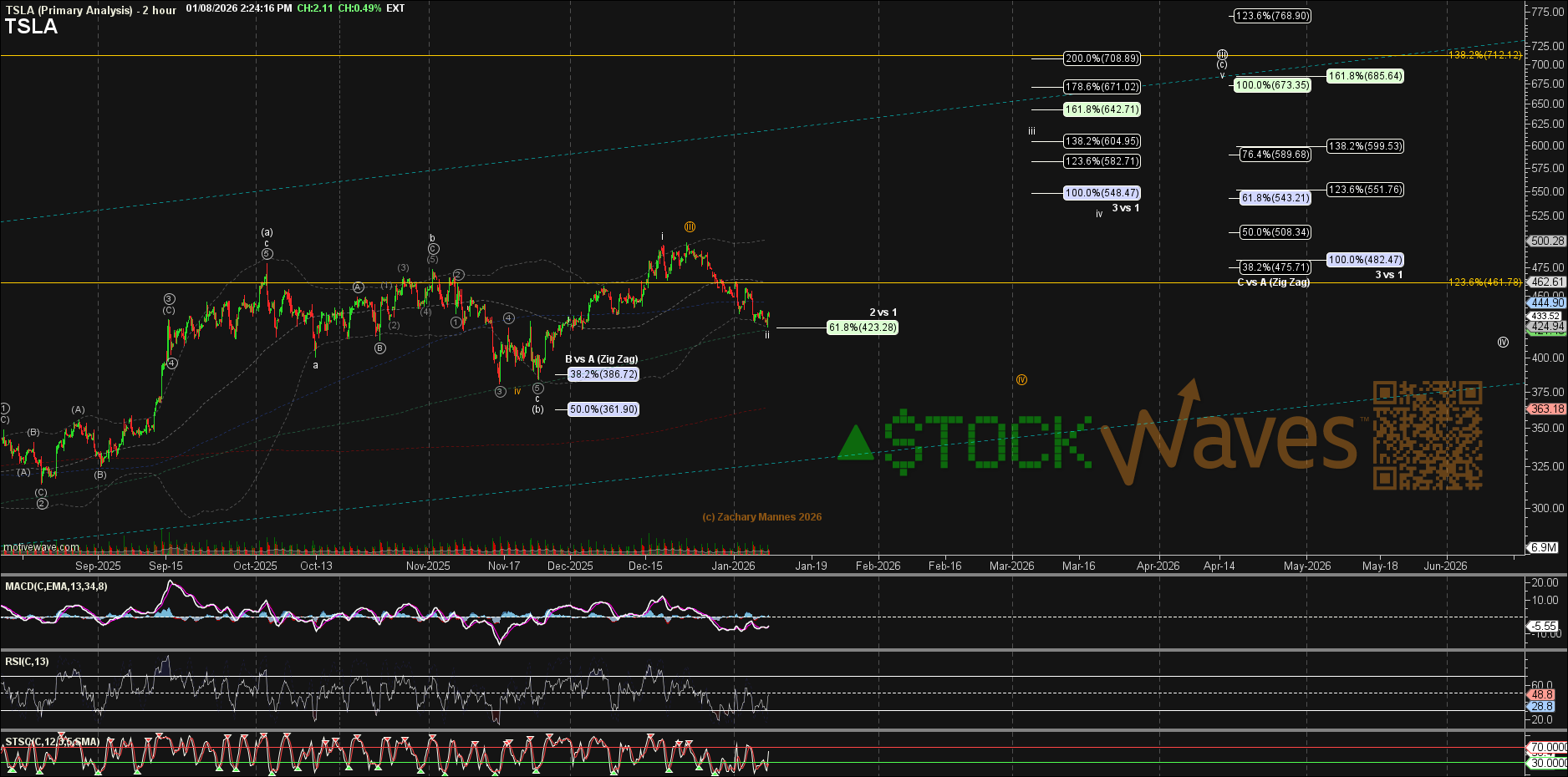 Yes, that orange circle ‘iv’ is there, but as an alternative. The primary scenario based on probabilities is the white path illustrated here. Holding $430 near term is ideal. What’s more, we can actually gain even more granularity with a lower time interval chart.