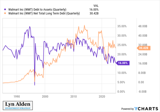 Walmart’s balance sheet is a fortress, much like other top stocks like Alphabet and Nvidia. They have an AA credit rating, and only $30 billion in net debt, which is about 18 months of net income and a small fraction of their $700+ billion market capitalization. Their debt-to-assets ratio is among the lowest it has been in a long time.
