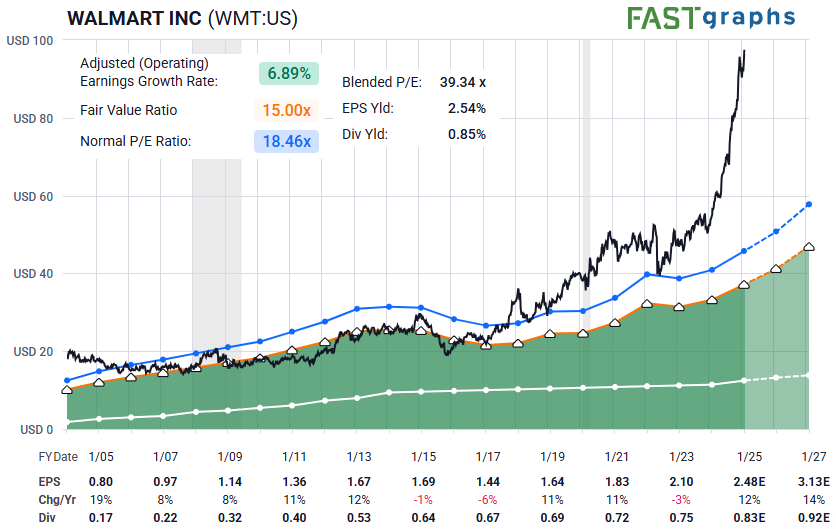 To put that into perspective, Walmart is trading at a much higher price/earnings ratio than companies like Alphabet (GOOGL) that have faster earnings growth rates. It’s nearly as high of a price/earnings ratio as Nvidia (NVDA).